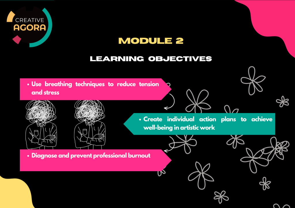 Module 2 introduces issues of well-being and mental health care for artists and art educators in the context of the uncertainty of the post-Covid times. It introduces techniques and methods you can use to take care of balance in your artistic work, and that you can introduce to adult learners and mentees.